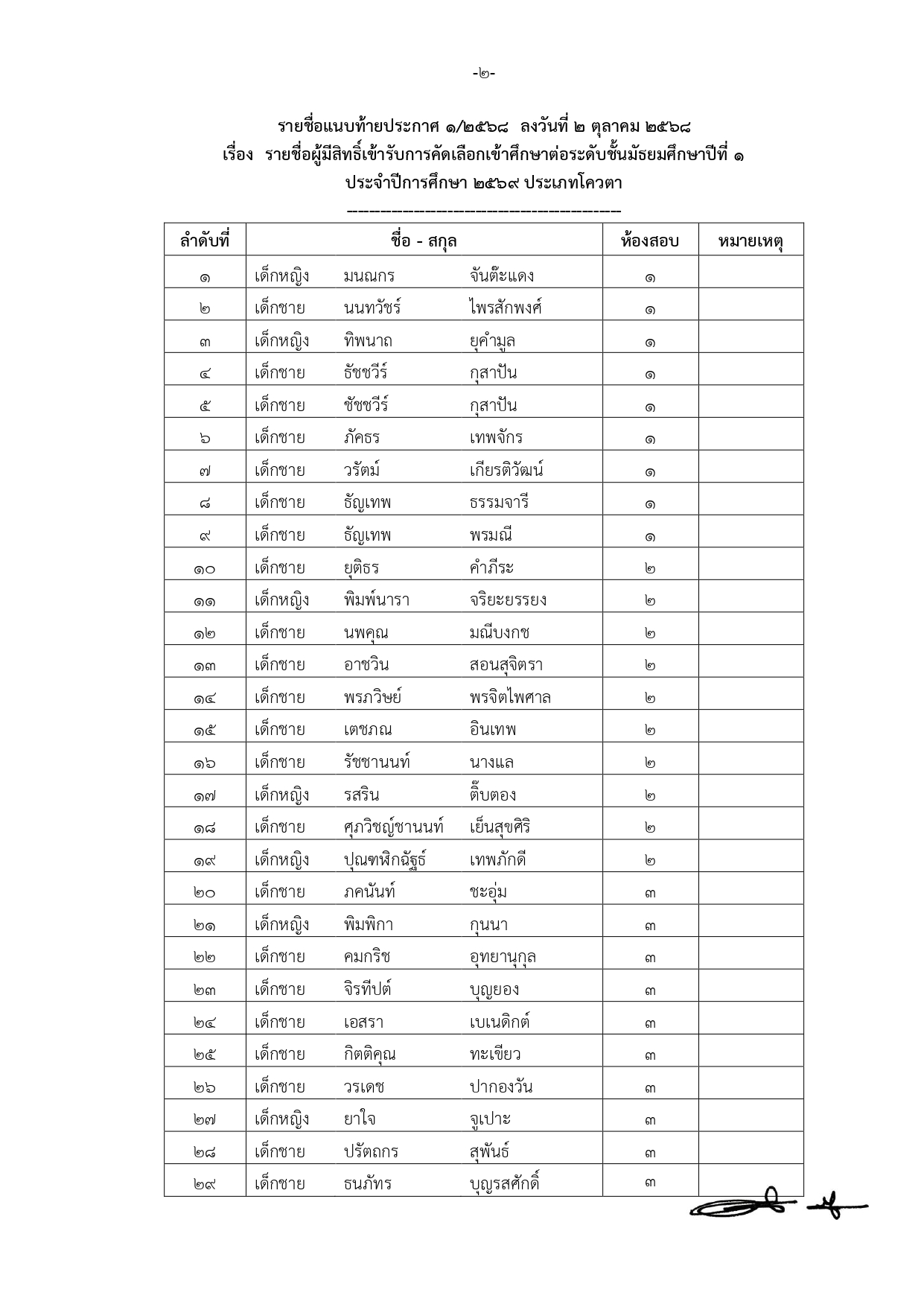 ประกาศรายชื่อผู้มีสิทธิ์เข้ารับการคัดเลือก เพื่อเข้าศึกษาต่อในระดับ ชั้นมัธยมศึกษาปีที่ 1 ประจำปีการศึกษา 2569 ประเภทโควตา